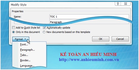 Chú ý rằng khi click Format, bạn sẽ có lựa chọn thay đổi như Font, Paragraph, Tabs, … bạn cũng có thể thay đổi các cài đặt của từng phần và xem lại chúng trong mục Preview trước khi áp dụng cho bảng mục lục.