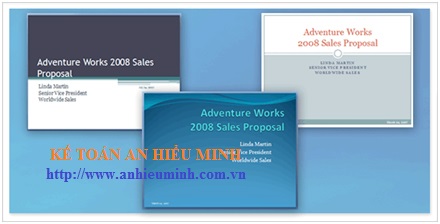 Mỗi bài thuyết trình có một chủ đề. Chủ đề xác định phong cách và màu sắc cho slide của bạn. Trên hình là ba kiểu slide có cùng một nội dung, nhưng với ba chủ đề khác nhau. Một chủ đề bao gồm: